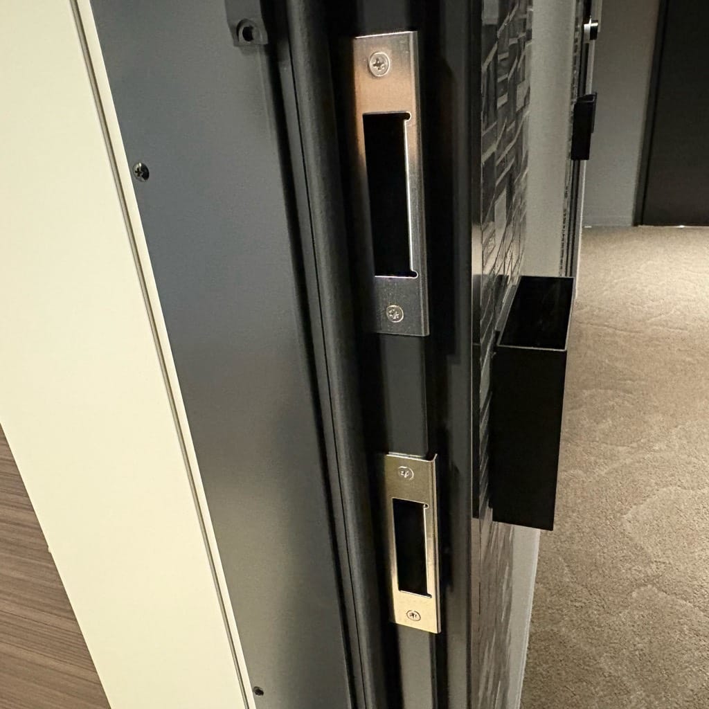 見た目には異常がないようでしたが、ドアを確認すると受け側の位置が微妙にずれており、扉を強く閉めないとラッチが正しい位置に収まらない状態でした。
