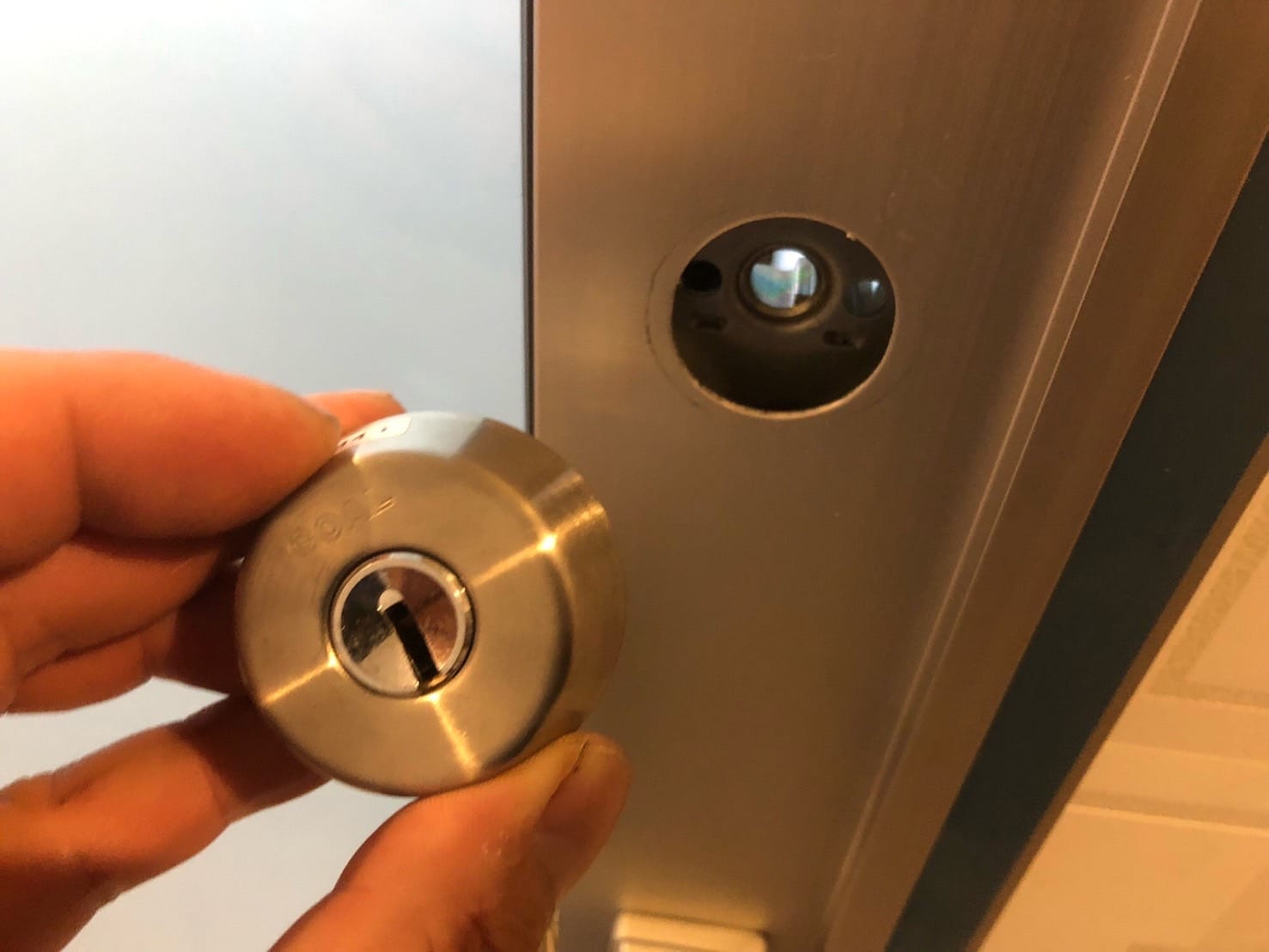 鍵交換完了。扉のシリンダー近くで付属の鍵を持っている