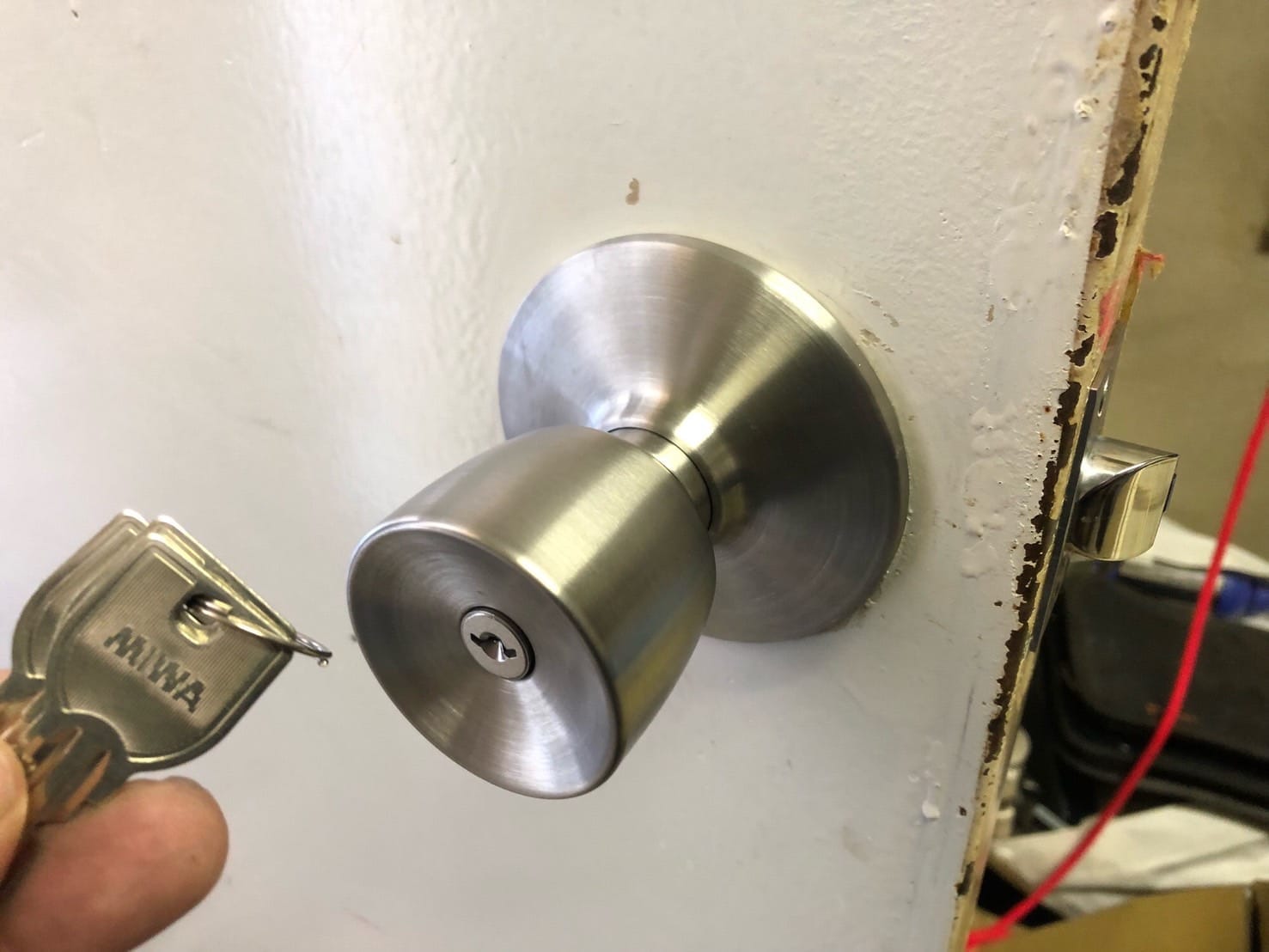 鍵交換完了。扉のシリンダー近くで付属の鍵を持っている