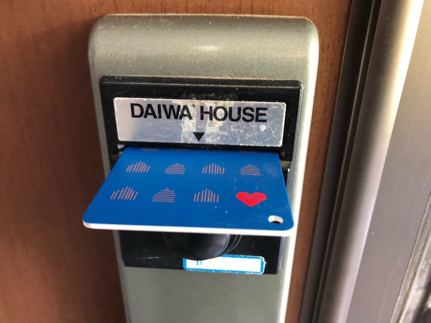 アパートの玄関ドアにはMIWAのカードキーのレバーハンドル錠が付いていました。