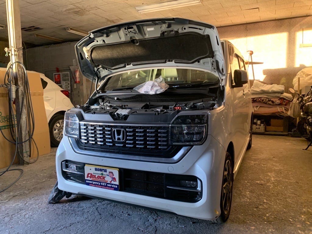 広島市内の板金工場様より、作業中のエヌワゴンがスマートキーを車内に残したまま鍵がかかってしまったので解錠して欲しいとご連絡いただきました。
