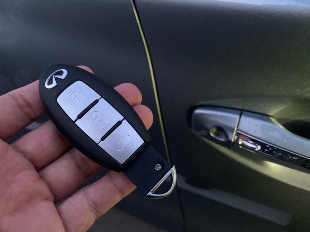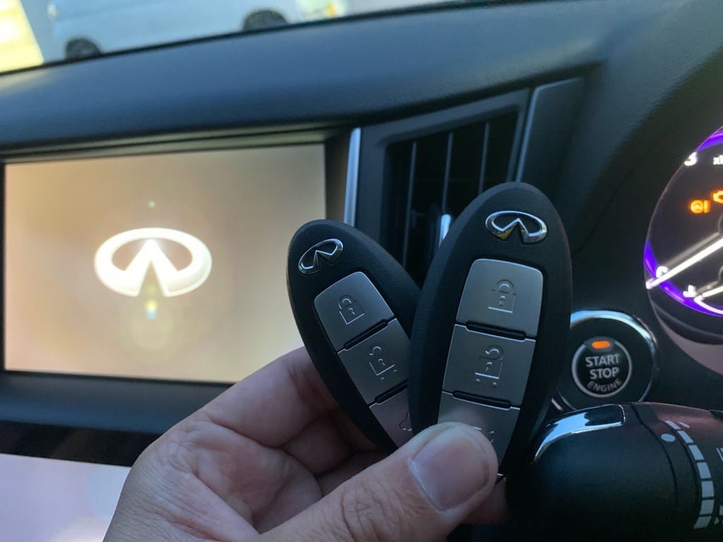 到着後すぐに作業へ取りかかり、インフィニティロゴのトランクボタン付きインテリジェントキーの登録と、