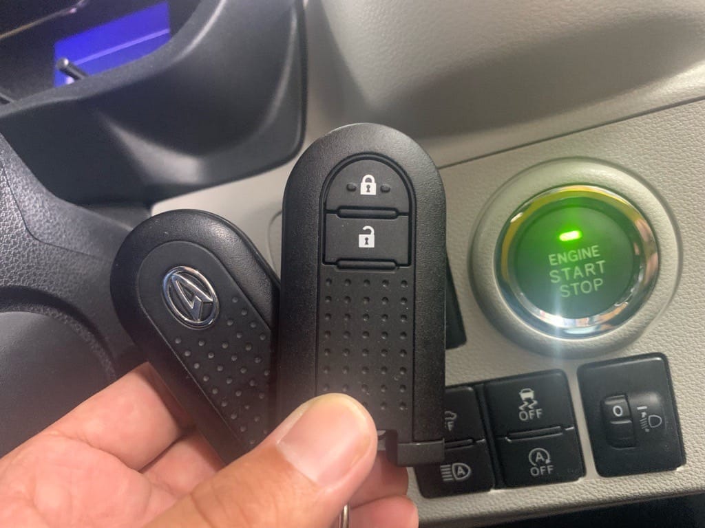 営業車として使用される事の多いミライースはイグニッションシリンダーへ鍵を挿して回す仕様が多いですが、今回はプッシュスタート仕様のため、キーフリーリモコンの追加登録を行いました。