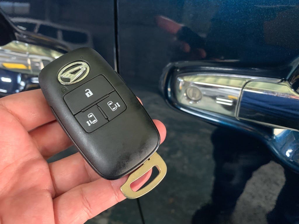 現行型ダイハツ車に多く採用されるキーフリーリモコンで、ダイハツロゴがロックボタンを兼ねているのが特徴です。