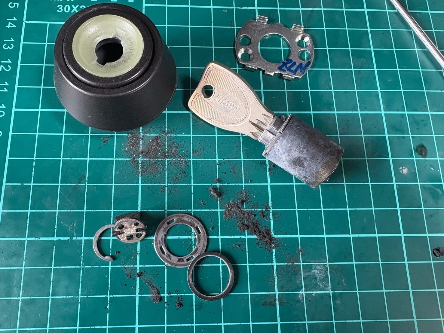 内部に溜まった汚れが原因なので、キーシリンダーを分解して内部の洗浄を行いました。鍵の抜き差し、回りやすさともに新品時のような操作性を取り戻すことができました!